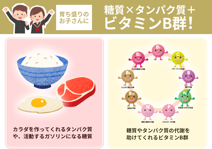 成長期のお子様のカラダの成長を助けてくれる糖質・タンパク質をバランス良く摂取しつつも、代謝の促進をしてくれるビタミンB群を併せて摂取すると効果的だと言われています。